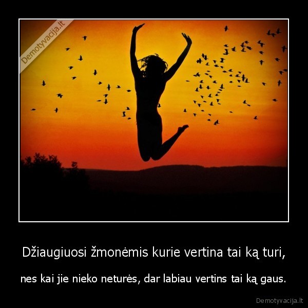 Džiaugiuosi žmonėmis kurie vertina tai ką turi, - nes kai jie nieko neturės, dar labiau vertins tai ką gaus.Naujausi demotyvatoriai |